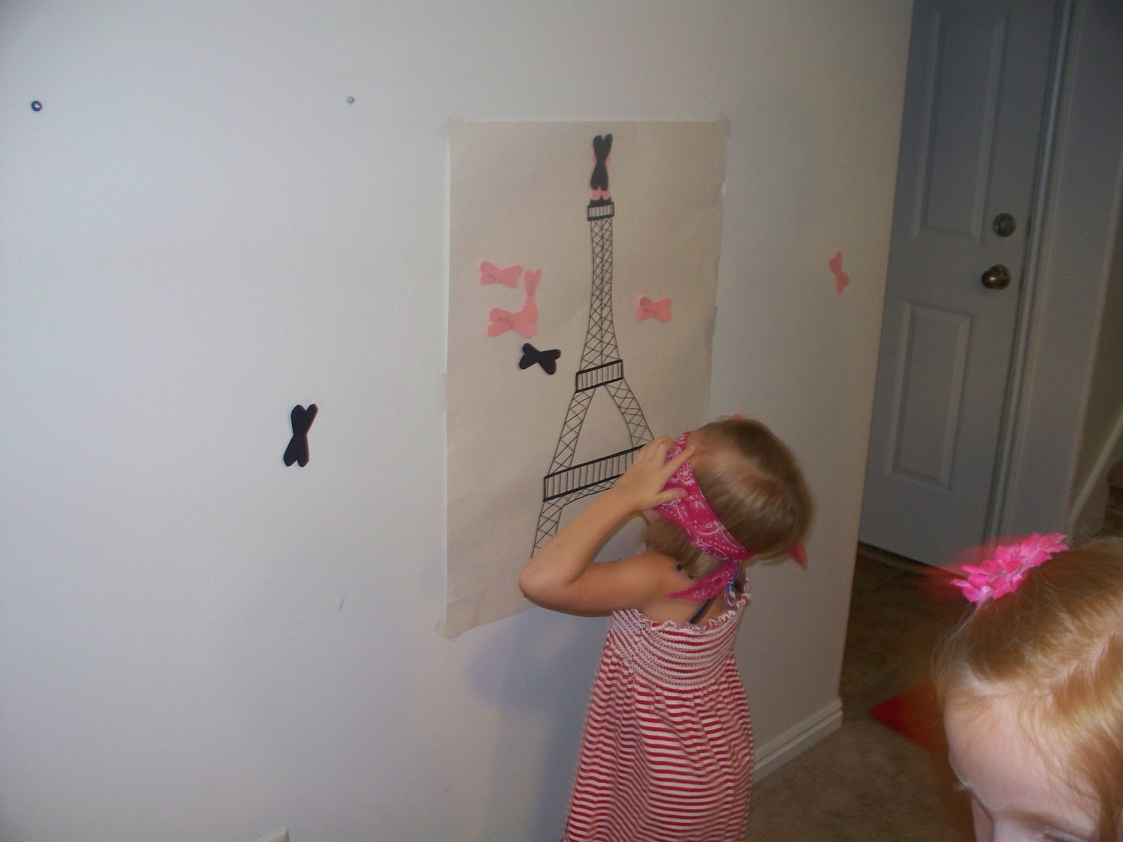After painting, we went downstairs for games. I pulled up a YouTube video of one of Ada's favorite French songs she learned at school and the kids played a game that was like a combination of musical chairs and spoons. They had a lot of fun and Jace came out the winner. While I was setting up, the kids were being crazy (I am so not used to boys!) so my mom got them all to sit down and play telephone. She was so helpful during the party! We then played pin-the-butterfly-on-the-Eiffel-Tower (Ada's idea) and got pictures in the photo booth